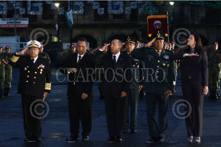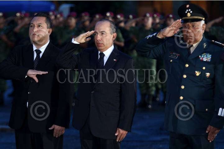 MÉXICO D.F., 19SEPTIEMBRE2010.- El presidente Felipe Calderón acompañado de Francisco Saynez, secretario de Marina; José Francisco Blake Mora, secretario de Gobernación; Guillermo Galvan, secretario de la Defensa Nacional y Laura Gurza Jaidar, coordinadora general de Protección Civil durante el acto del izamiento de Bandera por motivo de los sismos de 1985 que se realizo en la explana del Zócalo capitalino. FOTO: RODOLFO ANGULO/CUARTOSCURO.COM