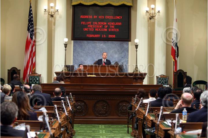 SACRAMENTO, CALIFORNIA., 13 FEBRERO2008.- El presidente Felipe Calderón durante la sesión conjunta en la Asamblea de California que tuvo lugar en el salón plenario del Capitolio estatal. FOTO: ALFREDO GUERRERO/CUARTOSCURO.COM