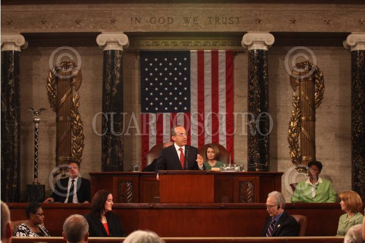 WASHINGTON, D.C., ESTADOS UNIDOS DE AMÉRICA, 20MAYO2010.- Felipe Calderón Hinojosa, presidente de México, continúa con su gira de estado por este país donde participó en una sesión conjunta del Congreso de los Estados Unidos de América, que tuvo lugar en la sala del pleno del capitolio. FOTO: IMPERIO RESENDIZ/CUARTOSCURO.COM