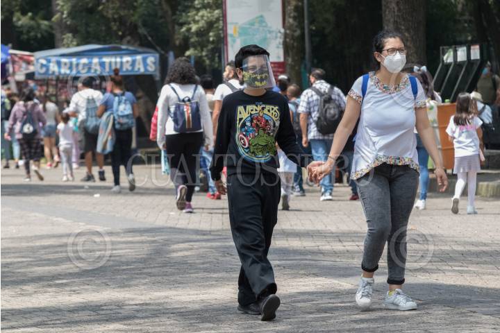 Madre e hijo con cubrebocas caminan el Bosque de Chapultepec. Autoridades capitalinas anunciaron que la capital esta unos cuantos puntos de regresar al semáforo verde de la alerta epidemiológica por el Covid-19.