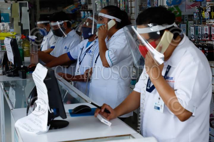Empleados de una farmacia se protegen de posibles contagios de Covid-19 con cubrebocas y caretas, en Yucatán, como en todo el país, los casos van al alza.