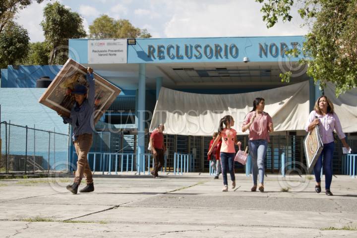 CIUDAD DE MÉXICO, 16JULIO2019.-Un cargador ayuda a una madre y a sus hijas a trasladar hasta la salida un marco realizado al interior del Reclusorio Norte. FOTO: ROGELIO MORALES /CUARTOSCURO.COM