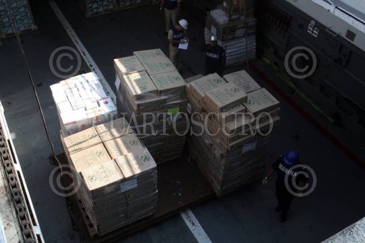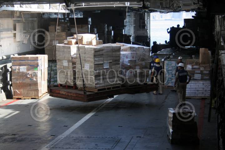VERACRUZ, VERACRUZ, 20ENERO2010.- La Secretaría de Marina, continúa con la recepción y carga de ayuda para los damnificados de Haití que se encuentra dentro del recinto de la Administración Portuaria Integral de Veracruz (APIVER) proveniente de distintas partes del país. Hasta el día de hoy se ha completado el 50% del buque de Guerra Anfibia ARM Papaloapan A-411 de la Secretaría de Marina-Armada de México, anclado dentro del recinto portuario. Será hasta el próximo viernes cuando el "Papaloapan" zarpe con 600 toneladas de alimentos y medicinas así como personal a bordo. FOTO: JOSÉ CANDELARIO/CUARTOSCURO.COM