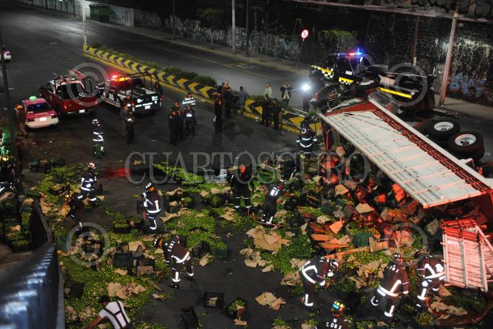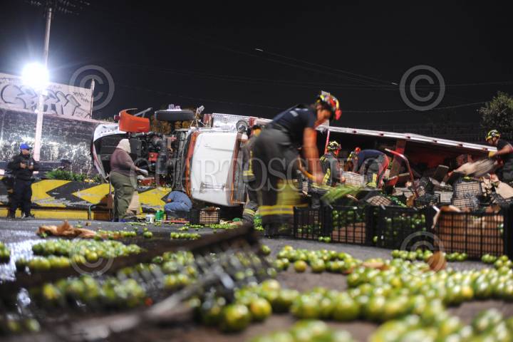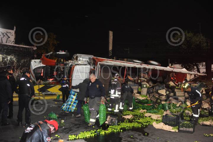 CIUDAD DE MÉXICO., 26NOVIEMBRE2019.- Un camión tipo torton cargado con aproximadamente 30 toneladas de limón, volcó en la curva que se ubica en avenida Observatorio a la altura de Arquitecto Carlos Lazo en la colonia Tacubaya, del accidente no resultaron personas lesionadas. FOTO: LUIS CARBAYO /CUARTOSCURO.COM