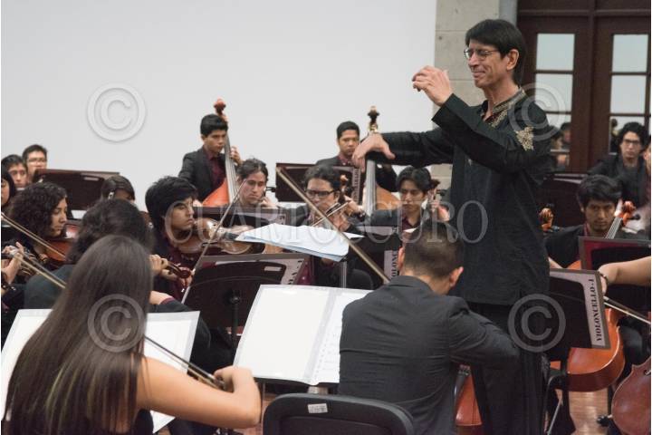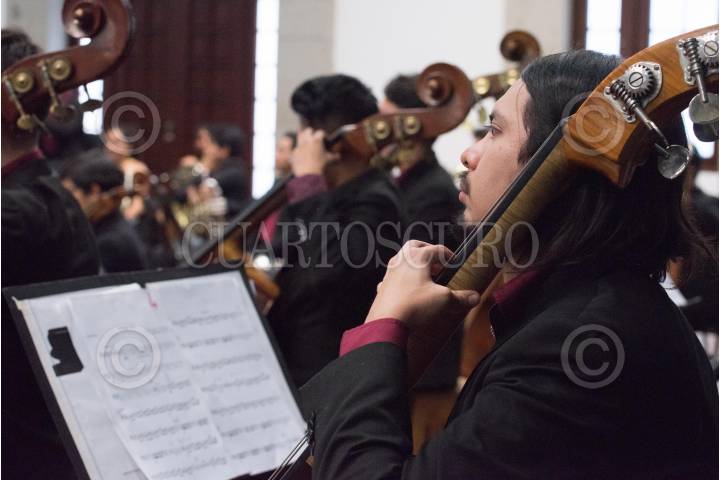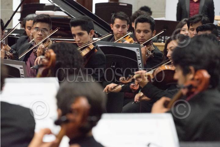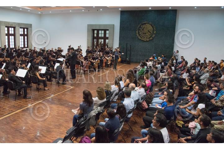 CIUDAD DE MÉXICO, 07SEPTIEMBRE2019.- La Orquesta-Escuela Carlos Chávez, como parte de las actividades que fomenta el Sistema Nacional de Fomento Musical (SNFM) ofreció un concierto bajo el título "Música y migración" en la que bajo la condución de Eduardo García Barrios, interpretaron las obras Amigo mío de Liliana Felipe; Adagio de la ópera Jerjes de Georg Friedrich Händel; Cerca del portón (Homenaje a Xonaca y a la mujer) de Nadia Borislova; La Martiniana en arreglo de Hernán del Riego; Fragmentos del Homenaje a García Lorca de Silvestre Revueltas y El sombrero de Tres Picos de la Suite núm. 2 de Manuel de Falla. El concierto fue realizado en Salón Adolfo López Mateos del Complejo Cultural Los Pinos. FOTO: MARIO JASSO /CUARTOSCURO.COM