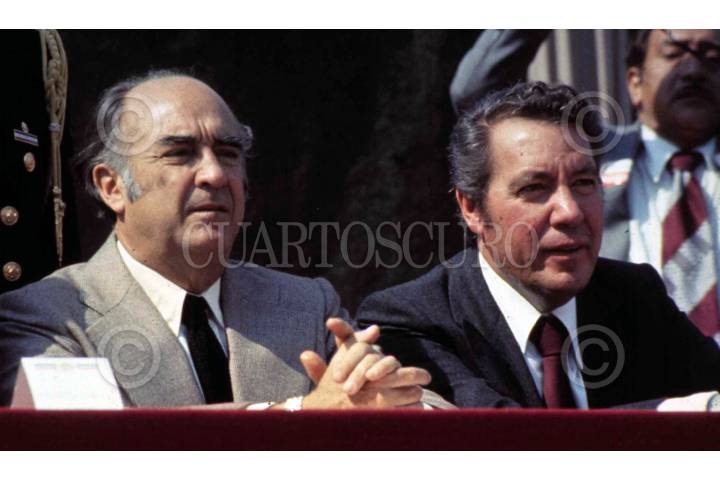 México D.F., 1980.- En la sala 3 de los velatorios militares se encuentran los restos mortales del ex presidente José López Portillo; acudieron a dar su pesame, Luis Echeverría Alvarez, Miguel de la Madrid Hurtado y Carlos Salinas de Gortari. FOTO: Pedro Valtierra/CUARTOSCURO.COM
