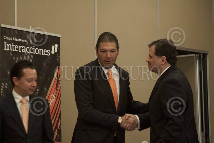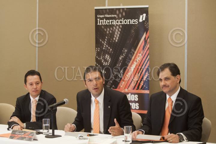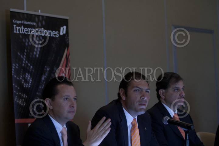 MÉXICO, D.F., 15FEBRERO2012.- Carlos Hank González, quien encabeza el Grupo Financiero Interacciones, durante la presentación de la cifras del ejercicio 2011 del consorcio. Lo acompañan Carlos Rojo, director general de administración, finanzas y operación, y Gerardo Salazar, director general de Banco Interacciones. Los activos totales del grupo aumentaron 26. 9% para cerrar el año en $116, 594 millones de pesos. FOTO: MOISÉS PABLO/CUARTOSCURO.COM