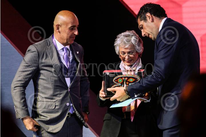 CIUDAD DE MÉXICO, 22AGOSTO2018.- Olga Sánchez Cordero, propuesta como próxima secretaria de Gobernación en el gobierno del presidente electo Andrés Manuel López Obrador, recibe un reconocimiento por parte de Carlos Hank González, Presidente de Grupo Financiero Banorte, por su participación en la conferencia: "Estado de Derecho" durante el foro Estrategia Banorte 2018. FOTO: MISAEL VALTIERRA /CUARTOSCURO.COM
