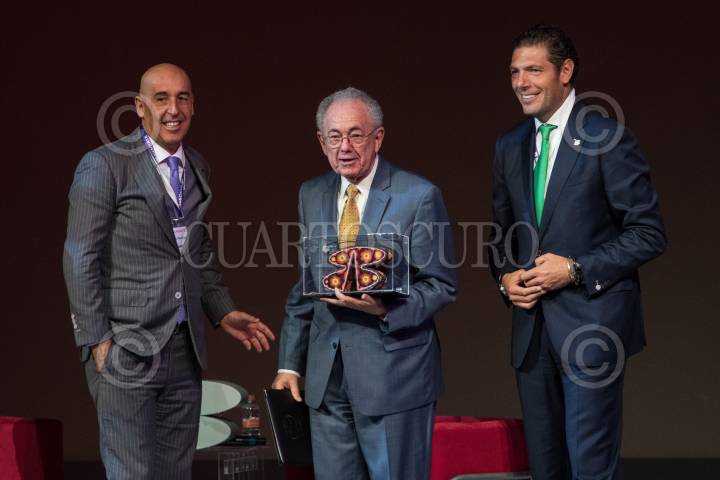 CIUDAD DE MÉXICO, 22AGOSTO2018.- Javier Jiménez Espriú, propuesto como próximo secretario de Comunicaciones y Transportes (SCT) en el gobierno del presidente electo Andrés Manuel López Obrador, recibe un reconocimiento por parte de Carlos Hank González, Presidente de Grupo Financiero Banorte, por su participación en la conferencia: "Infraestructura para el fortalecimiento de México" durante el foro Estrategia Banorte 2018. FOTO: MISAEL VALTIERRA /CUARTOSCURO.COM