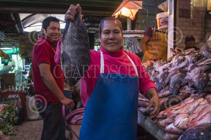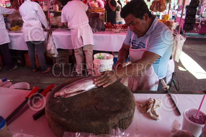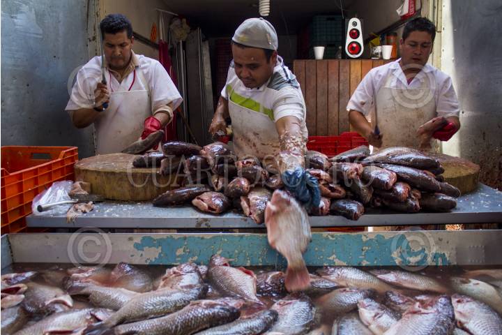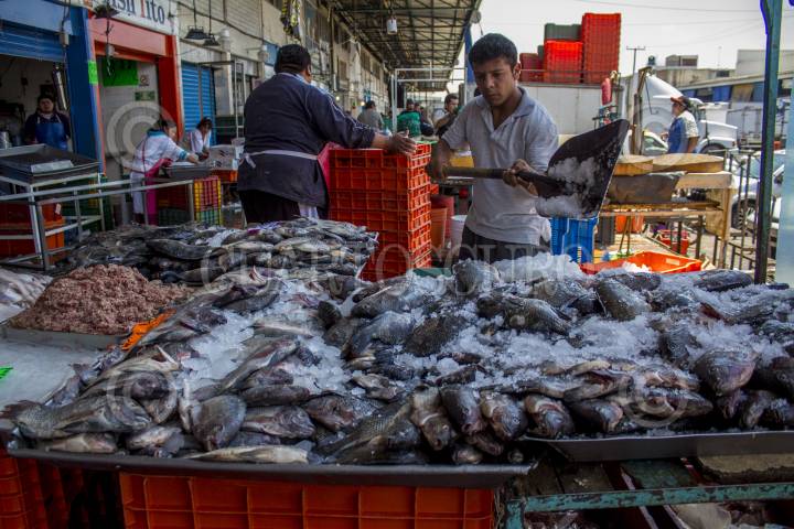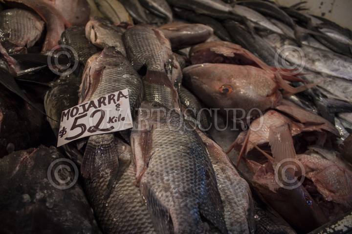 MEXICO, D.F., 12ABRIL2014.- La venta de pescados y mariscos en la ciudad se ha incrementado en esta temporada debido a la la celebración católica de la Cuaresma, durante la cual los adeptos a esta religión no deben consumir carnes rojas. Aunque el consumo promedio de pescado por parte de los mexicanos no rebasa los 10 kilos al año per capita, en estas fechas la demanda hace que vendedores y distribuidores de algunos mercados, como la Nueva Viga, trabajen hasta 15 horas diarias. FOTO: DAVID POLO /CUARTOSCURO.COM