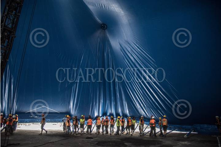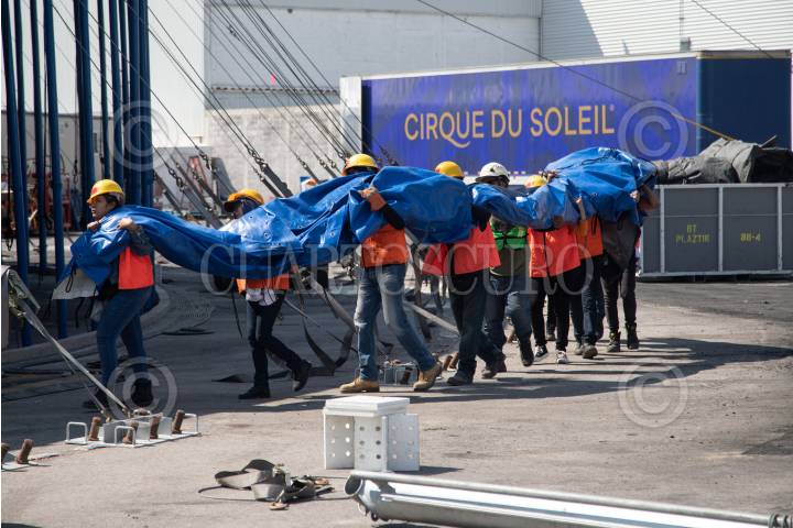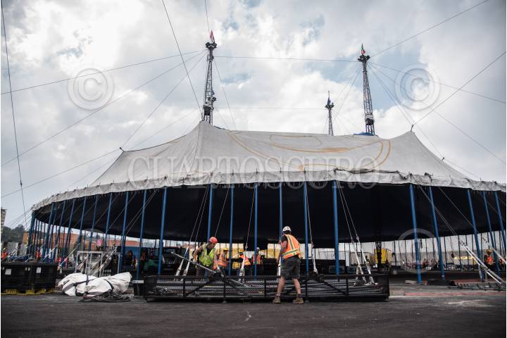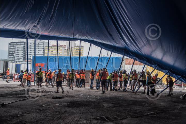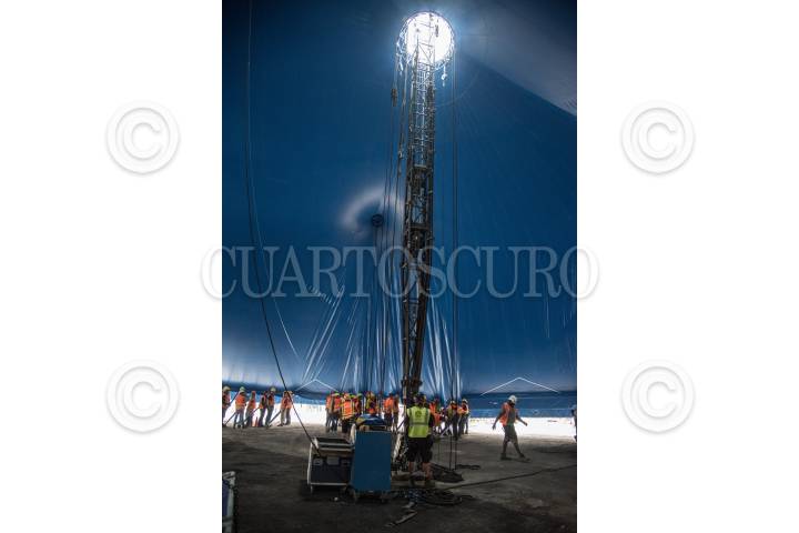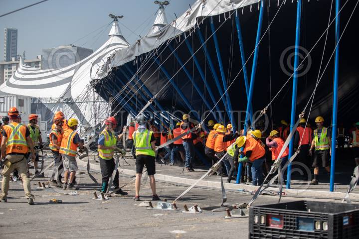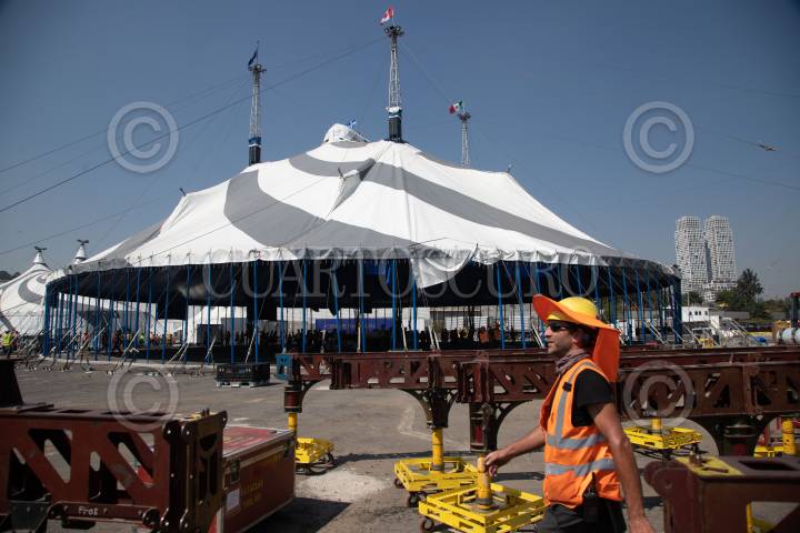 CIUDAD DE MÉXICO, 11NOVIEMBRE2022.- Levantamiento de la Carpa Santa Fe que albergará el espectáculo “Zooka” del Cirquero du Soleil. FOTO: EDGAR NEGRETE/CUARTOSCURO.COM