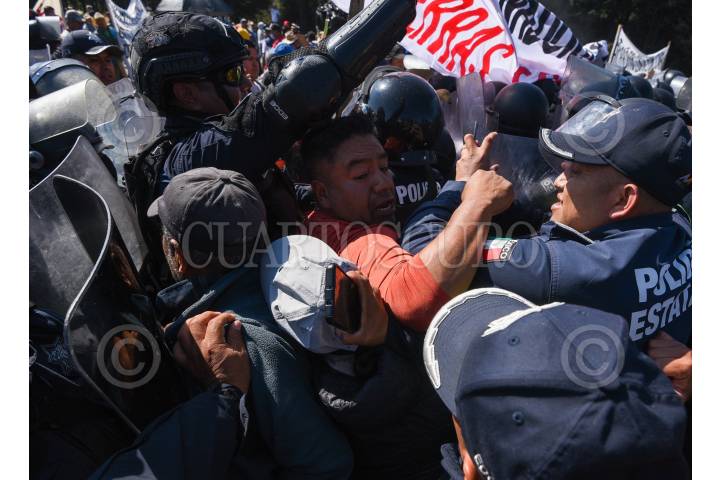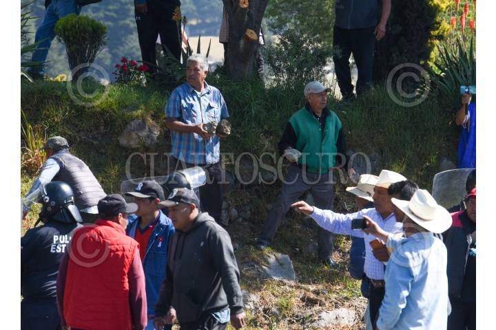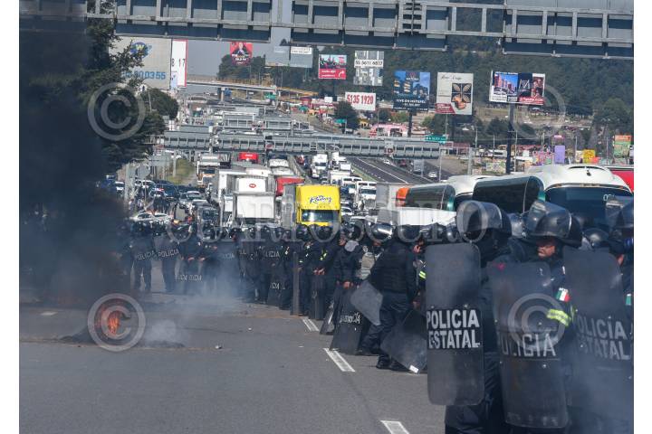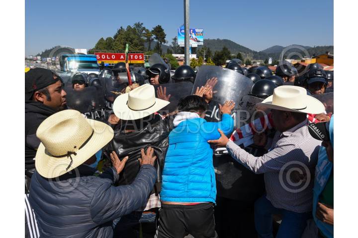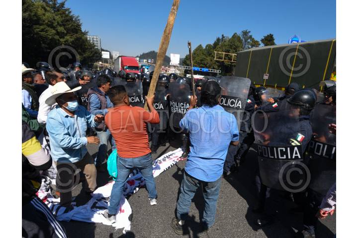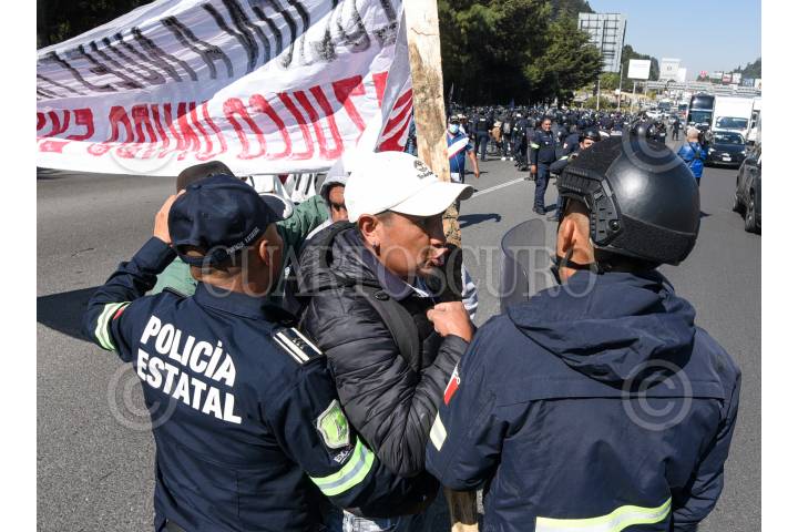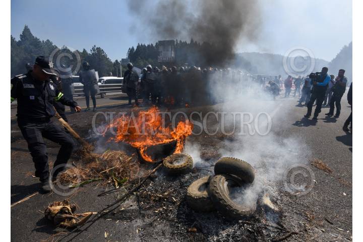 Ejidatarios de San Jerónimo Acazulco y San Lorenzo Acopilco bloquearon la carretera Toluca-México en ambos sentidos y fueron replegados por granaderos de la Secretaría de Seguridad estatal.
