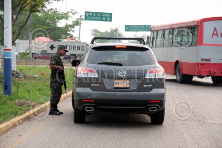 VILLAHERMOSA, TABASCO, 29MAYO2009.- Elementos de la 30 Zona Militar realizan revisiones aleatorias en automotores sospechosos, ya que continua la búsqueda de 25 sicarios que participaron a bordo de seis comboys vehiculares para intentar privarle la vida al subprocurador de justicia local. Los retenes están establecidos sobre las entradas y salidas de la ciudad; carretera a Macuspana, carretera a Teapa, carretera a Cárdenas y carretera a Centla, en donde también vigilan elementos de la Policía Estatal de Seguridad Pública. FOTO: MARCO POLO GUZMÁN HERNÁNDEZ/CUARTOSCURO.COM