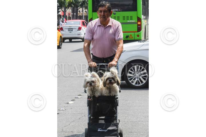 CIUDAD DE MÉXICO, 14SEPTIEMBRE2024.- Un hombre traslada a sus mascotas en una carriola mientras se desplaza en las calles del centro histórico. FOTO: MARIO JASSO/CUARTOSCURO.COM