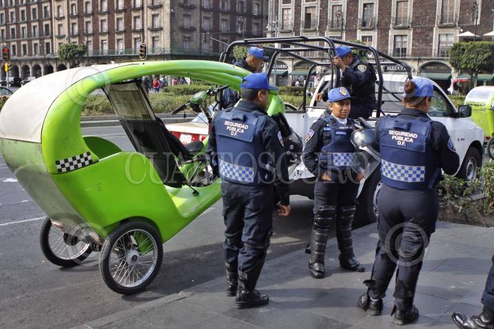MÉXICO, D.F., 29ENERO2014.- Policías de la SSPDF adscritos al cuerpo encargado de combatir el comercio informal en la zona centró de la capital, se llevaron esta mañana a los carritos eléctricos que se ocupan para trasladar a los paseantes por esta zona, los propietarios argumentaron que ellos tienen los permisos correspondientes para ejercer esta actividad. FOTO: MOISÉS PABLO /CUARTOSCURO.COM