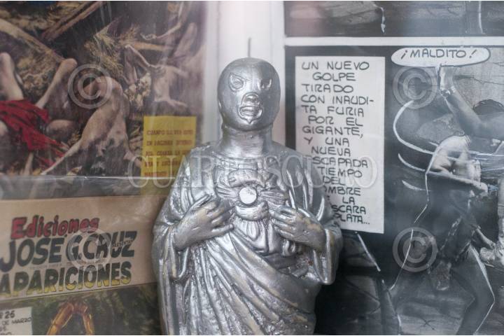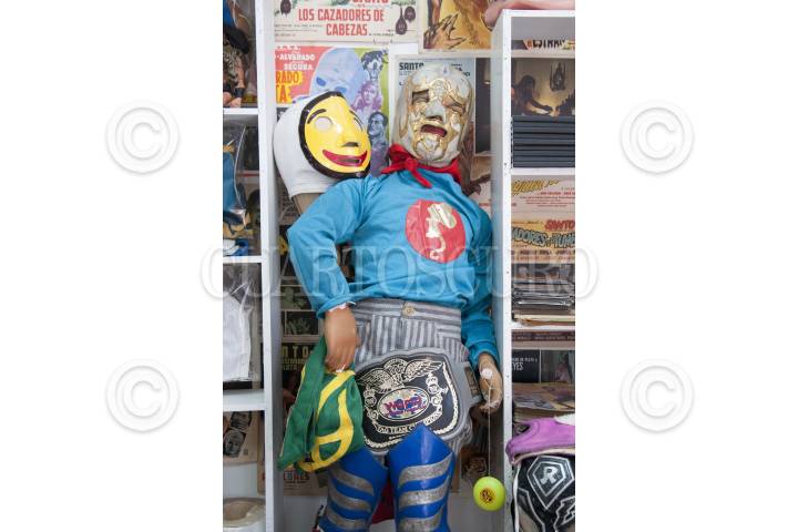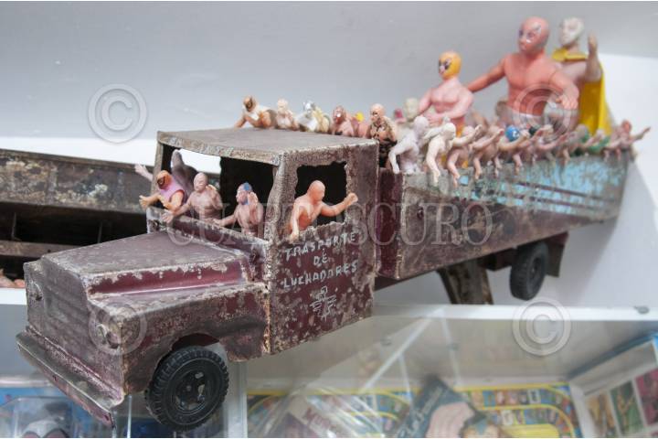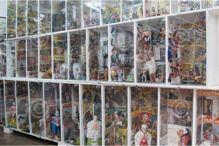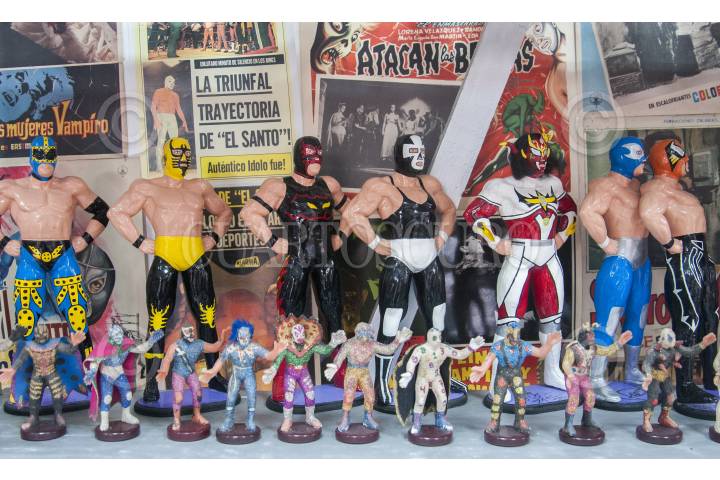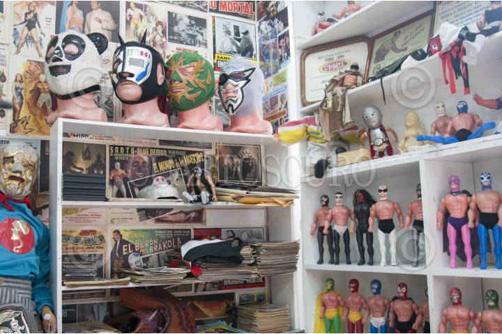 MÉXICO, D.F., 03ENERO2015.- Como una forma distinta de abordar la historia y la cultura popular mexicana, el Museo del Juguete Antiguo de México, ubicado en la colonia Doctores, alberga una colección de más de 20 mil piezas en exhibición y más de un millón en su bodega. El pasado mes de noviembre fue inaugurado el Salón de la Lucha Libre Mexicana, donde se alberga un repertorio inédito de muñecos, máscaras originales, carteles de encuentros importantes, fotografías, documentos y todo lo que tenga que ver con el tradicional deporte mexicano. FOTO: DIEGO SIMÓN SÁNCHEZ /CUARTOSCURO.COM