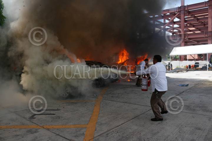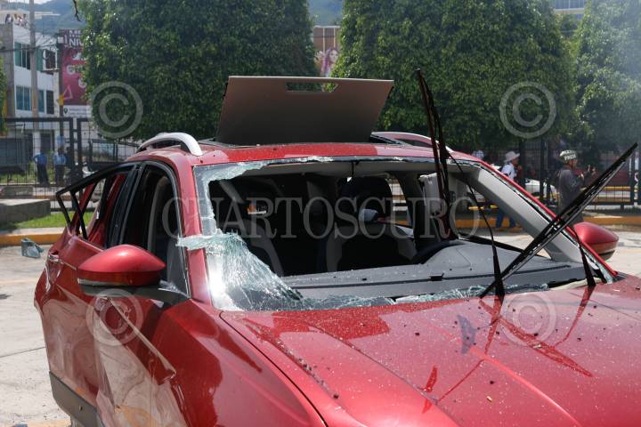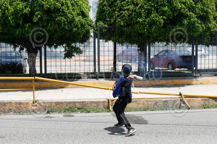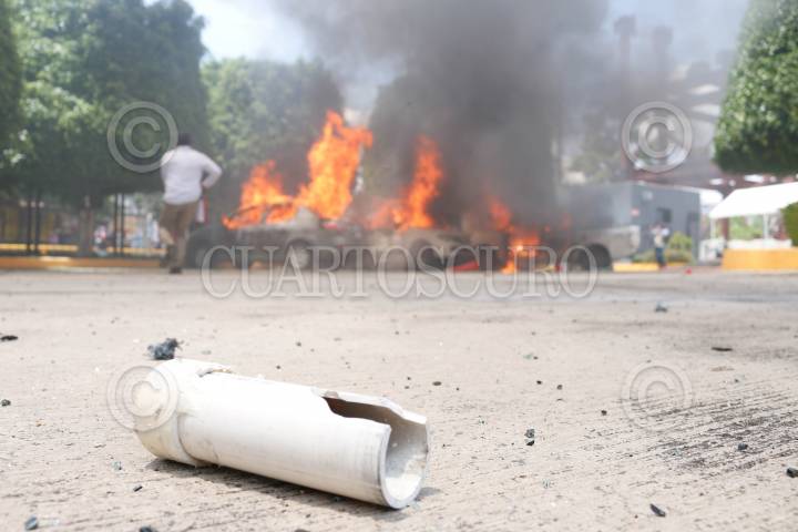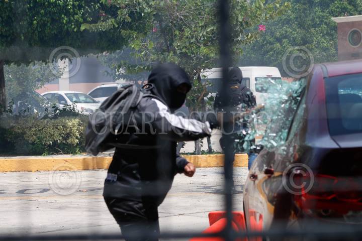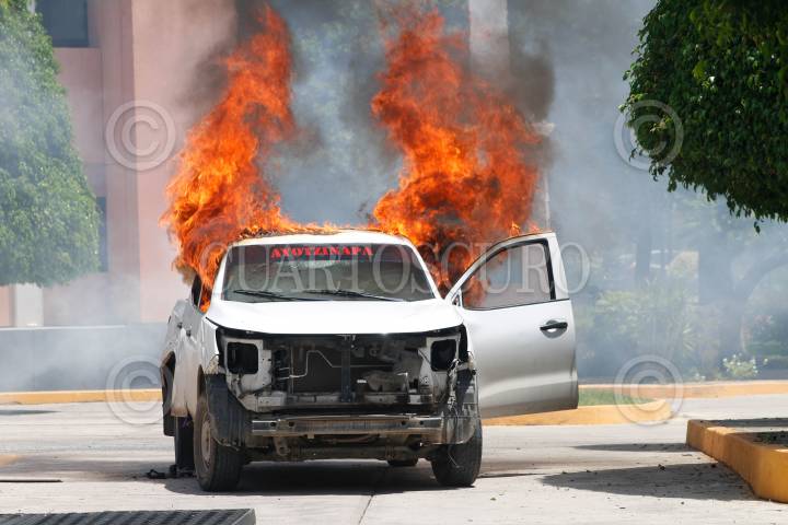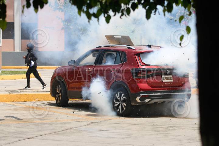 CHILPANCINGO, GUERRERO, 13SEPTIEMBRE2024.- Estudiantes de la Escuela Normal Rural ‘Raúl Isidro Burgos’ de Ayotzinapa y miembros de la Federación de Estudiantes Campesinos Socialistas de México (FECSM), lanzaron petardos y causaron destrozos en al menos 15 vehículos al interior del Congreso del estado de Guerrero. Desde las 11:30 horas abordo de siete autobuses y dos camionetas un grupo de 200 estudiantes, arribaron al exterior de recinto del Poder Legislativo cerrando de manera total la circulación vehicular, donde, en un segundo día de actividades, realizaron un mitin en el exterior del Congreso local como parte de las actividades rumbo a los 10 años de la desaparición de sus 43 compañeros. Pasado el mediodía luego de que concluyó el mitin, los estudiantes utilizaron una camioneta, en la que se transportaban, como ariete para derribar la puerta del estacionamiento y posteriormente prenderle fuego. Una vez dentro causaron destrozos en al menos quince vehículos a los cuales le lanzaron petardos, de estos, solo 3 fueron consumidos totalmente por el fuego, además de lanzar más petardos al interior del inmueble. Durante el mitin, que se llevó a cabo en la entrada del estacionamiento, los jóvenes condenaron que al cierre de la administración del presidente Andrés Manuel López Obrador, este, no cumplió su compromiso durante seis años. FOTO: DASSAEV TÉLLEZ ADAME/CUARTOSCURO.COM