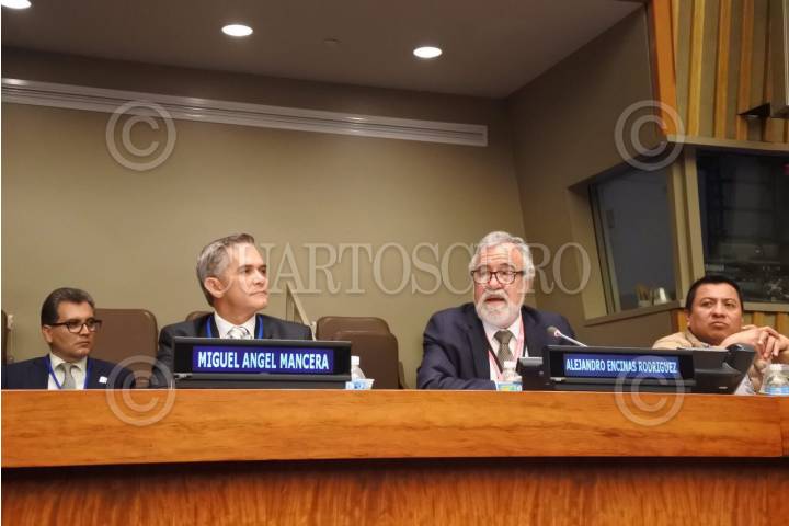 NUEVA YORK, ESTADOS UNIDOS, 27ABRIL2017.- Miguel Ángel Mancera, Jefe de Gobierno, acudió ante la Organización de Naciones Unidas a a exponer los avances de la Constitución capitalina. El mandatario resaltó que la Carta Magna de la Ciudad de México puede ser considerada como la Capital Indígena de América, tan solo por el número de personas que se auto-adscriben en este grupo, 784 mil, es decir, 8.8 por ciento del total de la población. Además se hablan 55 lenguas indígenas, con más de 129 mil hablantes. FOTO: GOBIERNO CDMX /CUARTOSCURO.COM