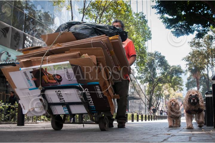 CIUDAD DE MÉXICO, 31DICIEMBRE2018.- Un señor que recolecta cartón camina en compañía de sus dos perros sobre la calle Génova de la Zona Rosa. FOTO: DIEGO SIMÓN SÁNCHEZ /CUARTOSCURO.COM