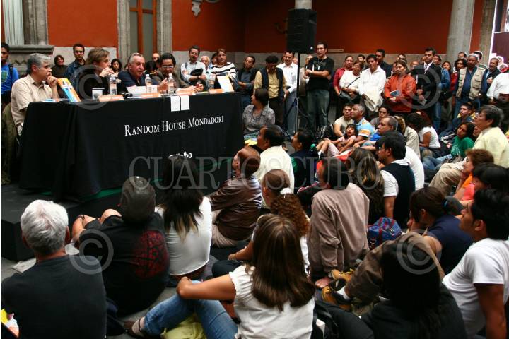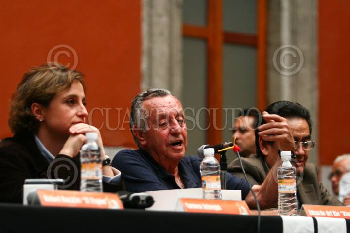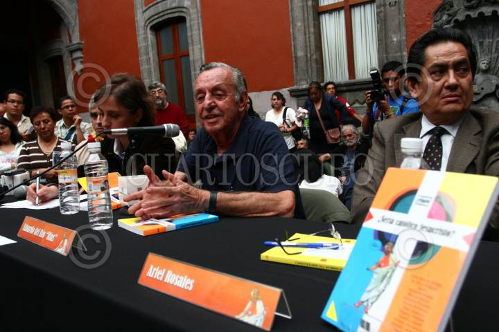 MEXICO, D.F., 05AGOSTO2008.- Ante un abarrotado patio del Museo de la Ciudad de México, el escritor y cartonista Eduardo del Río "Rius", presentó su libro "¿Sería Católico Jesucristo", y estuvo acompañado por la periodista Carmen Aristegui y el caricaturista Rafael Barajas Durán "El Fisgon". FOTO: ISAAC ESQUIVEL/CUARTOSCURO.COM