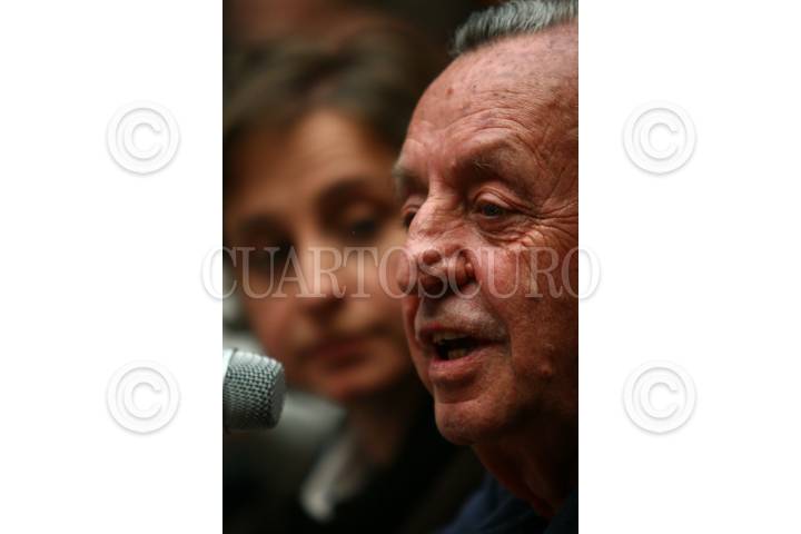 MEXICO, D.F., 05AGOSTO2008.- La periodista Carmen Aristegui y el escritor y dibujante Eduardo del Río "Rius", durante la presentación del libro de éste "¿Sería Católico Jesucristo", en el Museo de la Ciudad de México. FOTO: ISAAC ESQUIVEL/CUARTOSCURO.COM