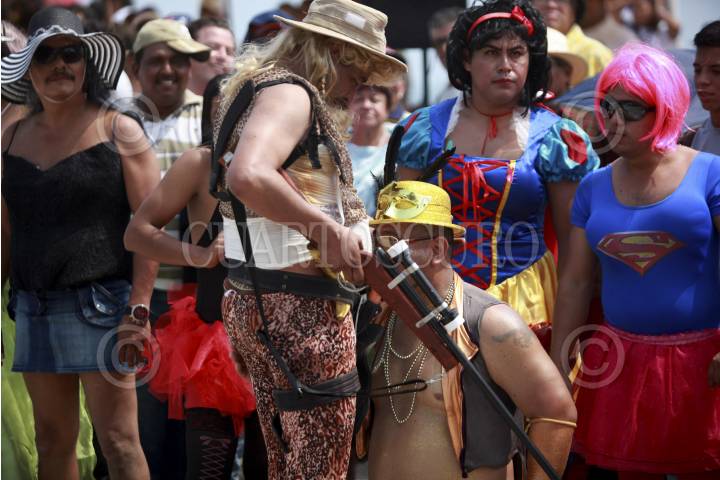 VERACRUZ, VERACRUZ, 12FEBRERO2012.- La mañana de este domingo se llevó a cabo el tradicional partido de Solteras contra Casadas donde los beisbolistas se disfrazan de mujer como preludio a la fiesta de la carne. FOTO: FÉLIX MÁRQUEZ/CUARTOSCURO.COM
