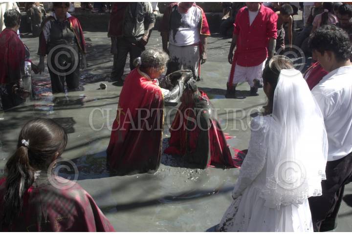 MINA, NUEVO LEON17OCTUBRE.2004.- Una pareja de novios realizó la ceremonia de su casamiento en el Charquito, bajo la sombra de un pirul, en el lodo y en presencia de un medium o cajita, que representa al Niño Fidencio. Como testigos hubo decenas de familiares y amigos de la pareja. Fidencio un hombre que atendió a enfermos sin recursos, hasta 1938 en esta comunidad de Espinazo, celebro hoy su 106 aniversario de nacimiento y miles de persona, de todo el país y EE UU llegaron a festejarlo y le rendirle culto. FOTO: PEDRO VALTIERRA/CUARTOSCURO.COM