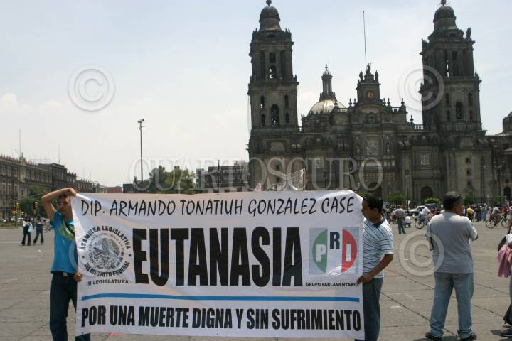 MÉXICO, D.F. 17JUNIO2007.- El diputado del PRI Armando Tonatiuh Gonzalez Case mostro mantas a favor de la eutanasia sobre la plancha de la constitución. FOTO: SAÚL LÓPEZ/CUARTOSCURO.COM