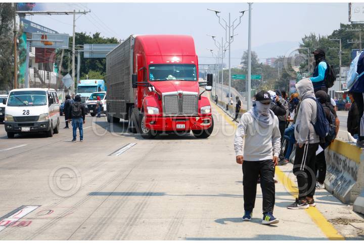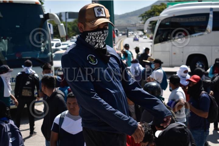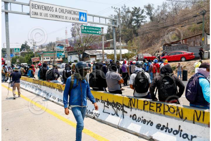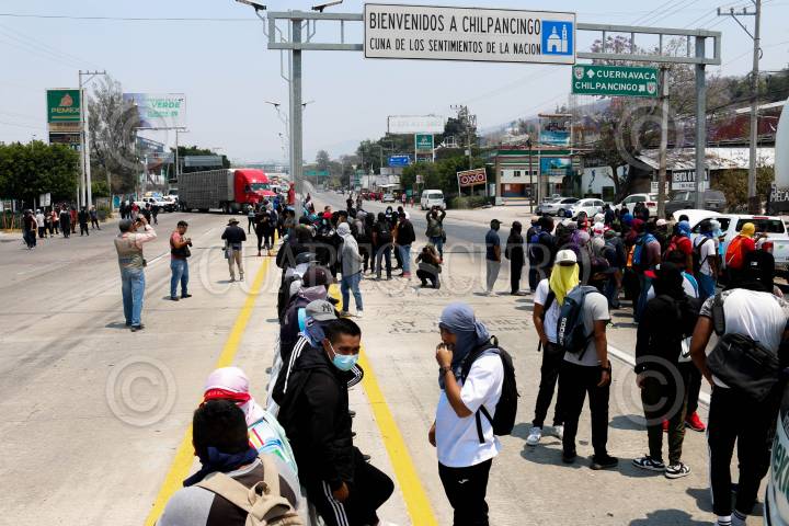 CHILPANCINGO, GUERRERO, 19ABRIL2024.- Durante 90 minutos, estudiantes del cuarto grado de la Normal Rural de Ayotzinapa llegaron a la parte sur de la capital de Guerrero para bloquear la Autopista del Sol. A través de un mitin exigieron justicia en el caso de Yanqui Kothan Gómez Peralta, además de la entrega de material didáctico y plazas para quienes egresan este año. Los jóvenes llegaron a bordo de tres autobuses, mismos que utilizaron para cerrar la vialidad frente al punto conocido como El Parador del Marqués, en su mayoría tienen el rostro cubierto y se negaron a dar declaraciones a los medios de comunicación. FOTO: DASSAEV TÉLLEZ ADAME/CUARTOSCURO.COM