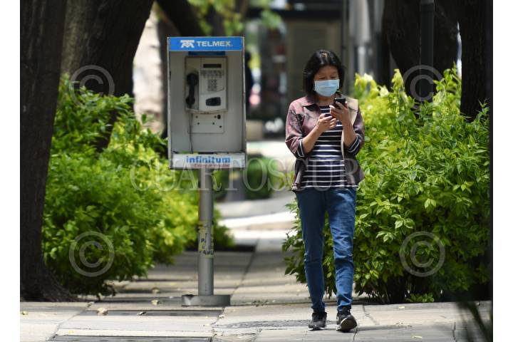 Una mujer utiliza su celular mientras pasa a lado de un teléfono público.
