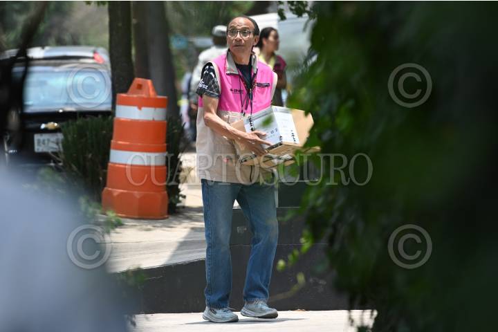 CIUDAD DE MÉXICO, 05JUNIO2024.- Un funcionario del INE sale de la Junta Distrital 16 con una caja de la institución en las manos. FOTO: DANIEL AUGUSTO/ CUARTOSCURO.COM