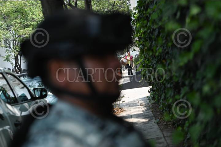 CIUDAD DE MÉXICO, 05JUNIO2024.- Elementos de la Guardia Nacional vigilan la Junta Distrital 16 dónde se lleva a cabo el conteo de votos. FOTO: DANIEL AUGUSTO/ CUARTOSCURO.COM