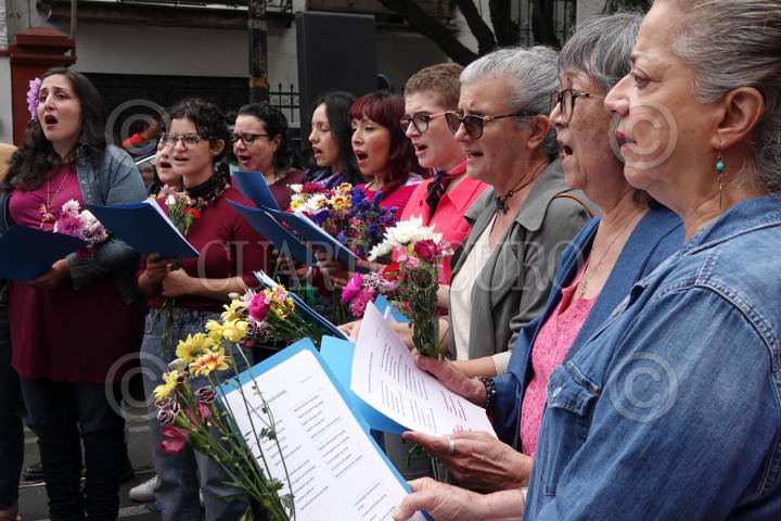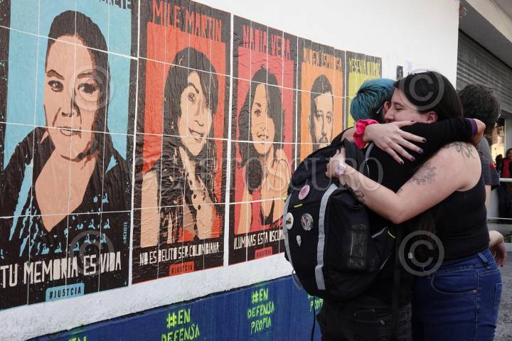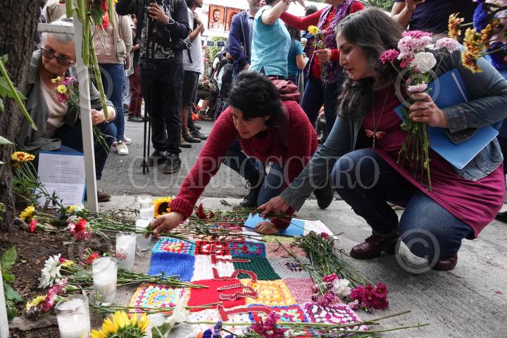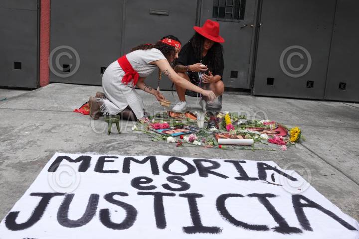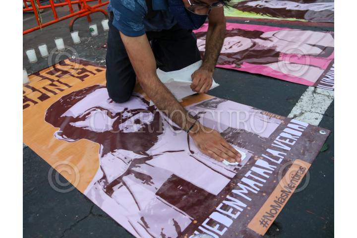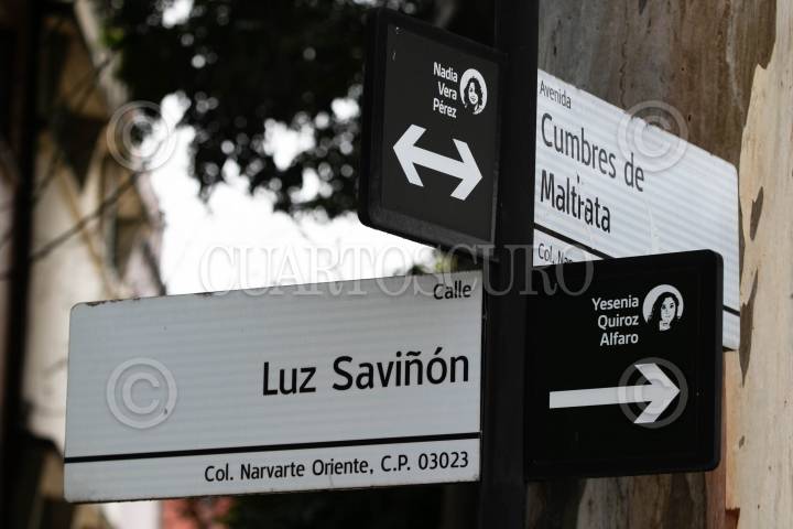 CIUDAD DE MÉXICO, 31JULIO2024.- A 9 años del multihomicidio de Nadia Vera, Mile Virginia Martín, Alejandra Negrete, Yesenia Quiroz Alfaro, y Rubén Espinosa, en un departamento de la calle Luz Saviñón en la colonia Narvarte; activistas y familiares rebautizaron las calles de esta zona para recordar y exigir justicia por sus amigas, amigo y familiares, ya que señalan que no ha habido avances en las investigaciones. También denunciaron que hace unos días habían colocado un memorial que fue retirado sin mayor explicaciones, hoy por la mañana realizaron una protesta en la FGJCDM para pedir resultados y encontrar a los culpables. FOTO: MOISÉS PABLO/CUARTOSCURO.COM