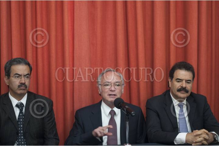 MÉXICO, D.F., 28AGOSTO2014.- Marco Antonio Calva, del Sindicato Nacional de Trabajadores de Transportes, Transformaciones, Aviación y Servicios Similares (SNTTTASS), Joaquín Ortega, abogado del caso Mexicana y Rafael Gutiérrez de la Asociación Sindical de Pilotos Aviadores (ASPA), durante la conferencia de prensa donde hablaron sobre el caso de Mexicana de Aviación a cuatro años del cese de vuelos en dicha aerolínea. FOTO: DIEGO SIMÓN SÁNCHEZ /CUARTOSCURO.COM