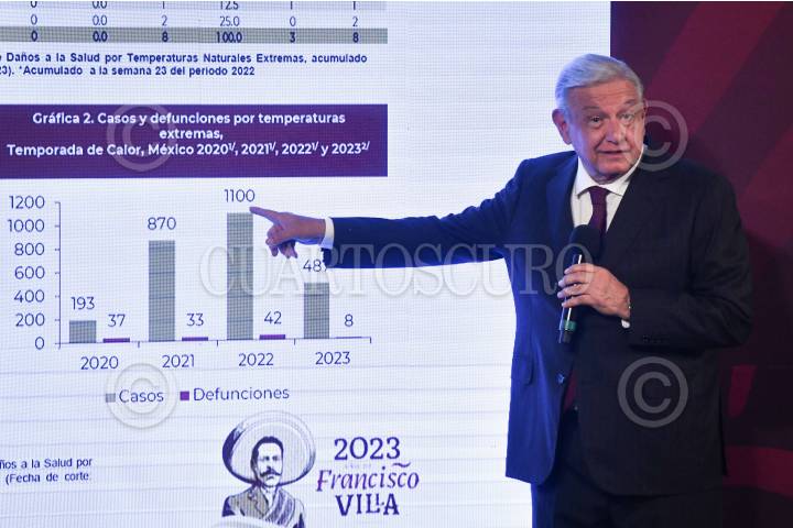 Andrés Manuel López Obrador, presidente de México, durante conferencia de prensa matutina, indicó el número de casos y defunciones por temperaturas extremas del 2020 al 2023.