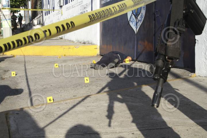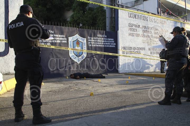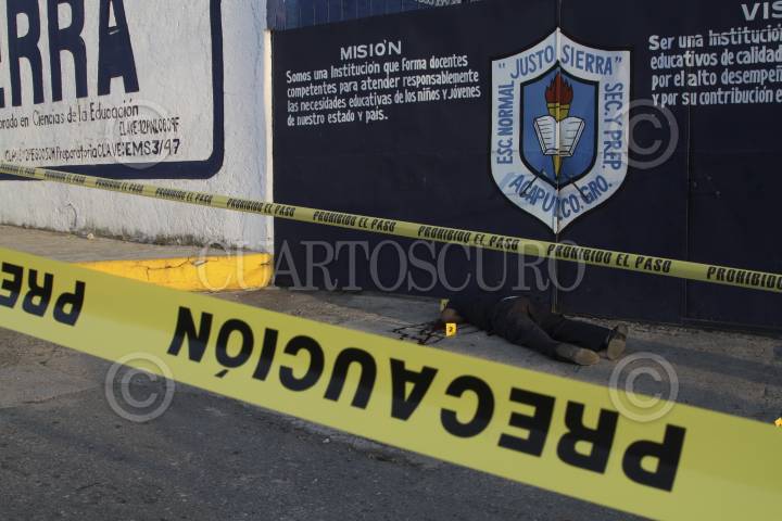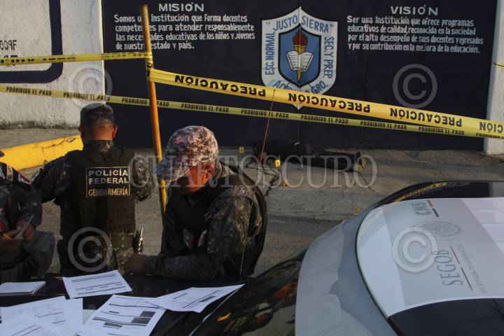 ACAPULCO, GUERRERO, 23SEPTIEMBRE2016.- Un policía auxiliar fue asesinado por impactos de bala cuando hombres desconocidos intentaron secuestrar a un alumno de la escuela “Justo Sierra”, ubicada entre la calle 10 y 11. Los hechos fue momentos antes de iniciar las clases por lo que hubo pánico entre padres de familia y alumnos, al menos 10 mochilas quedaron tirada sobre el piso en esta transitada vialidad de la avenida Ejido. Al lugar arribaron policías federales quienes impidieron que trabajadores de los medios de comunicación pudieran hacer fotografías. Elementos ministeriales y peritos realizaron las diligencias de ley encontrando mas de 16 casquillos percutidos. FOTO: BERNANDINO HERNÁNDEZ /CUARTOSCURO.COM
