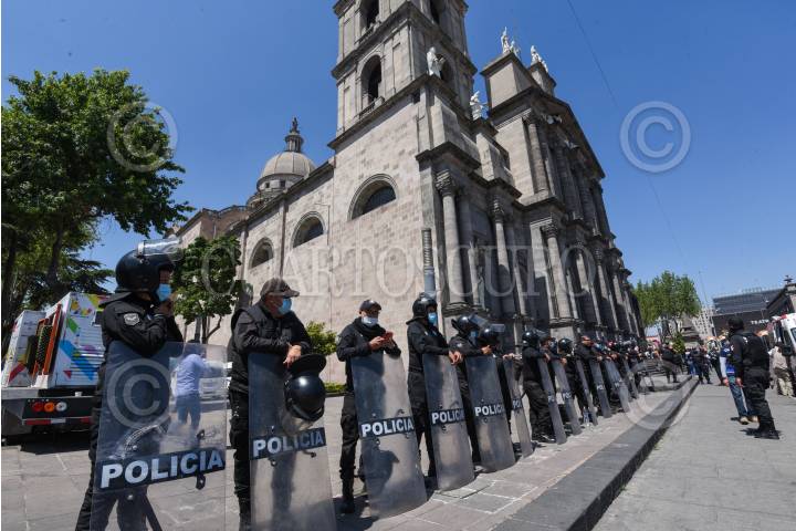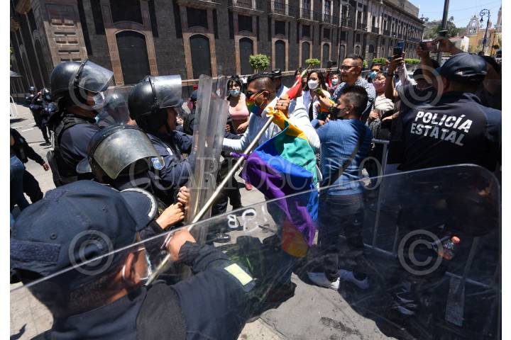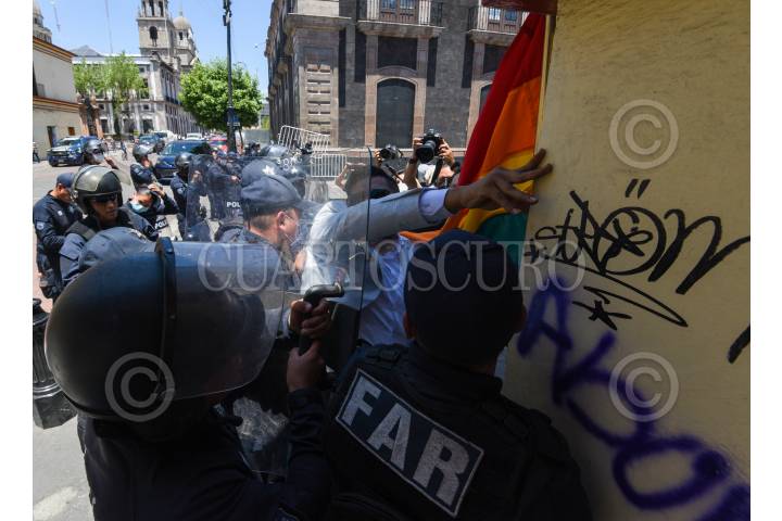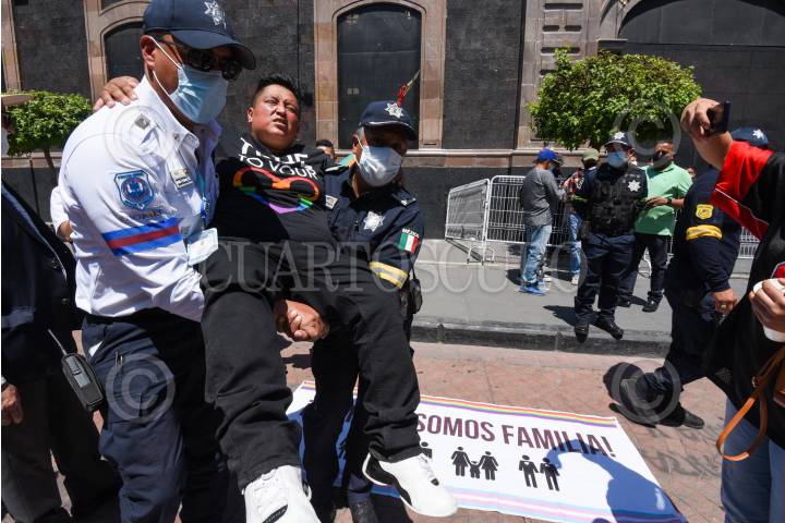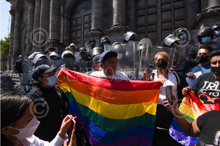 Integrantes de la comunidad LGBTTTIQ+ y policías estatales tuvieron un enfrentamiento en las inmediaciones de Catedral de Toluca durante la toma de Posesión del II Arzobispo de Toluca Raúl Gómez González.