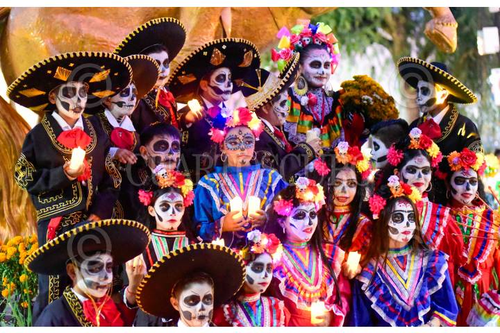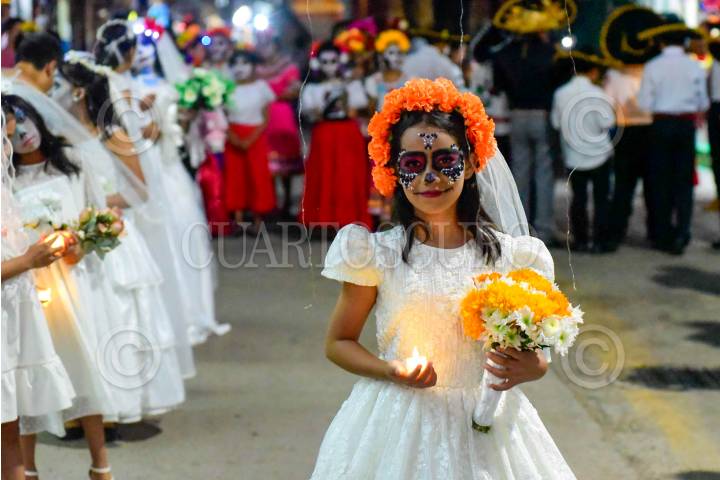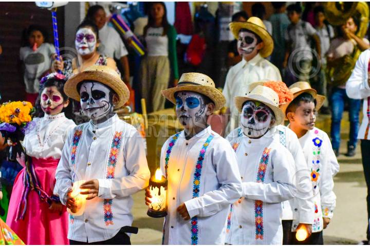 TLAPA, GUERRERO, 31OCTUBRE2024.- Cientos de niños de diferentes escuelas del municipio de Tlapa de Comonfort, en la región de la Montaña de Guerrero, participaron en una procesión de catrinas y catrines, en conmemoración al Día de Muertos. FOTO: CARLOS ALBERTO CARBAJAL/CUARTOSCURO.COM