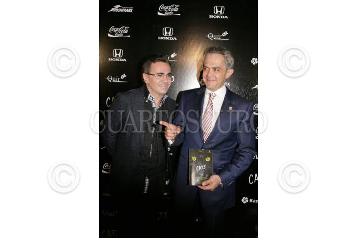 MÉXICO, D.F, 10MAYO2013.- Gerardo Quiroz, productor del musical Cats y Miguel Ángel Mancera, jefe de Gobierno del D.F:, anoche en la presentación del Musical CATS 2013, en el teatro San Rafaél, el cual cuenta con ocho toneladas de escenografía, 93 cambios de vestuario, orquesta en vivo y la actuación de más de 30 actores en escena. FOTO: JUAN PABLO ZAMORA /CUARTOSCURO.COM