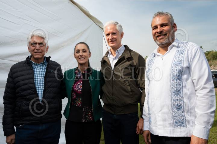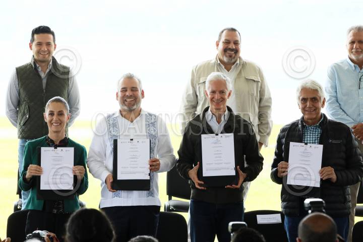 Claudia Sheinbaum, jefa de Gobierno de la capital; Germán Martínez Santoyo, director general de CONAGUA; Alfredo del Mazo, gobernador del Estado de México, y Alfredo Ramírez Bedolla, gobernador de Michoacán, encabezaron la firma de convenio Convenio “Recuperación De Caudales En El Canal El Bosque-Colorines”.