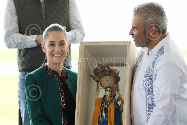Claudia Sheinbaum, jefa de Gobierno de la capital, y Alfredo Ramírez Bedolla, gobernador de Michoacán, al finalizar la firma de convenio Convenio “Recuperación De Caudales En El Canal El Bosque-Colorines”.