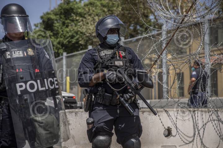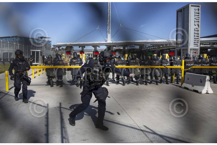 Agentes de seguridad estadounidenses realizan simulacro en garita internacional para evitar el cruce ilegal de migrantes.