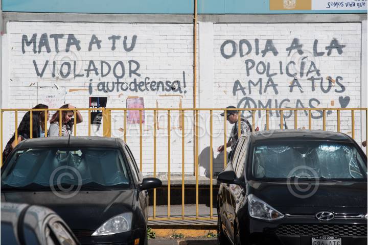 Mujeres que mantienen la toma del plantel CCH Vallejo caminan por las instalaciones; de fondo una consigna "Presidente rompa el pacto" #unvioladornoseragobernador