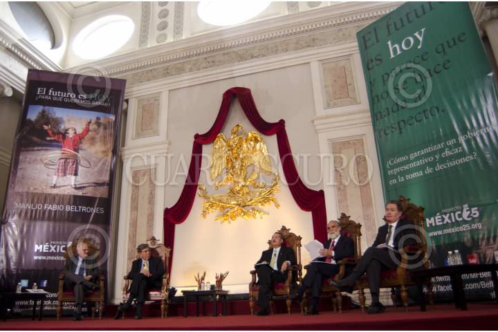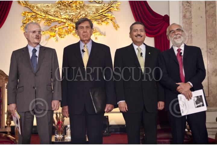 MÉXICO, D.F. 07NOVIEMBRE2011.- Cuauhtémoc Cárdenas Solorzano, líder moral del Partido de la Revolución Democrática (PRD); Manlio Fabio Beltrones, senador del PRI; Ricardo Rocha (moderador) y Diego Fernández de Ceballos, ex candidato presidencial (1988) por el Partido Acción Nacional (PAN); se reunieron esta mañana para presentar el ensayo "El futuro es hoy, ¿Para que queremos ganar?", escrito por Manlio Fabio Beltrones. Ésto se realizó ante la presencia de líderes de opinión, políticos y periodistas en el Palacio de MInería. FOTO: MISAEL VALTIERRA/CUARTOSCURO.COM