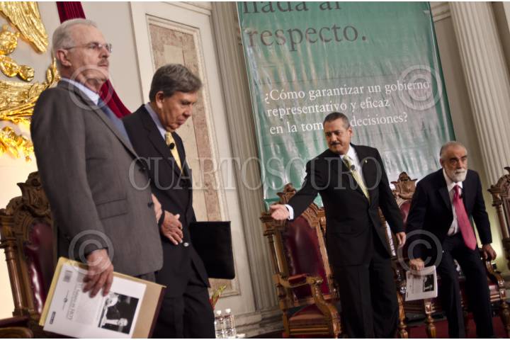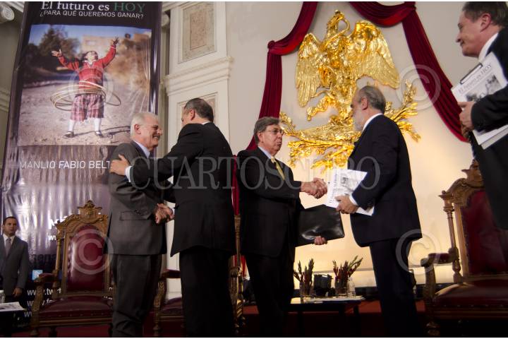 MÉXICO, D.F. 07NOVIEMBRE2011.- Francisco Labastida Ochoa, senador del Partido Revolucionario Institucional (PRI); Cuauhtémoc Cárdenas Solorzano, líder moral del Partido de la Revolución Democrática (PRD); Manlio Fabio Beltrones, senador del PRI y Diego Fernández de Ceballos, ex candidato presidencial (1988) por el Partido Acción Nacional (PAN); se reunieron esta mañana para presentar el ensayo "El futuro es hoy, ¿Para que queremos ganar?", escrito por Manlio Fabio Beltrones. Ésto se realizó ante la presencia de líderes de opinión, políticos y periodistas en el Palacio de MInería. FOTO: MISAEL VALTIERRA/CUARTOSCURO.COM