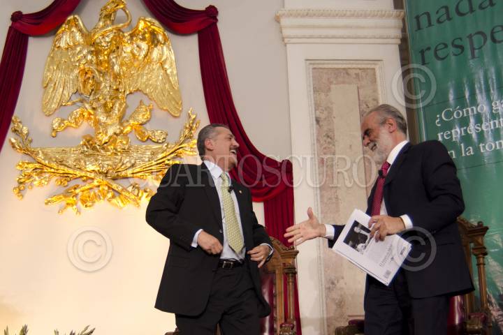 MÉXICO, D.F. 07NOVIEMBRE2011.- Manlio Fabio Beltrones, senador del PRI y Diego Fernández de Ceballos, ex candidato presidencial (1988) por el Partido Acción Nacional (PAN); se reunieron esta mañana para presentar el ensayo "El futuro es hoy, ¿Para que queremos ganar?", escrito por Manlio Fabio Beltrones. Ésto se realizó ante la presencia de líderes de opinión, políticos y periodistas en el Palacio de MInería. FOTO: MISAEL VALTIERRA/CUARTOSCURO.COM