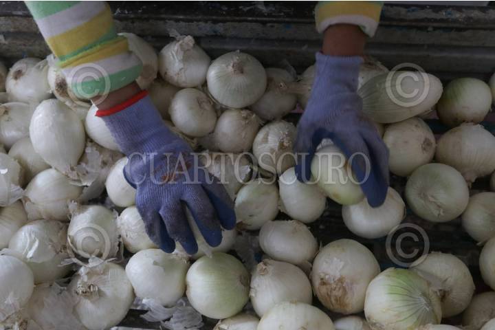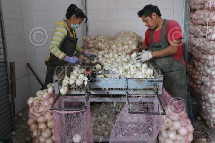 Locatarios de la Central de Abastos pelan y cargan cebollas durante su jornada laboral