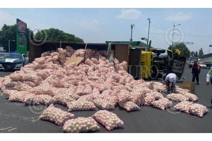 Un trailer que transportaba cebollas volcó en una curva en avenida Añil, en la alcaldía Iztacalco. No se reportaron heridos.