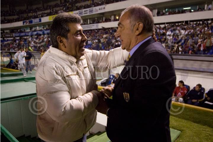 QUERÉTARO, QUERÉTARO 14NOVIEMBRE2009.- Carlos Reinoso director de Gallos Blancos y Miguel Anguel "El Zurdo" López, director técnico de San Luis, durante el partido de futbol Gallos Blancos de Querétaro VS Club San Luis, en la entrega 17 de la temporada apertura 2009. Celebrado en el estadio La Corregidora de Querétaro con un marcador final de 4-0 en favor de los locales. FOTO: DEMIAN CHÁVEZ/CUARTOSCURO.COM