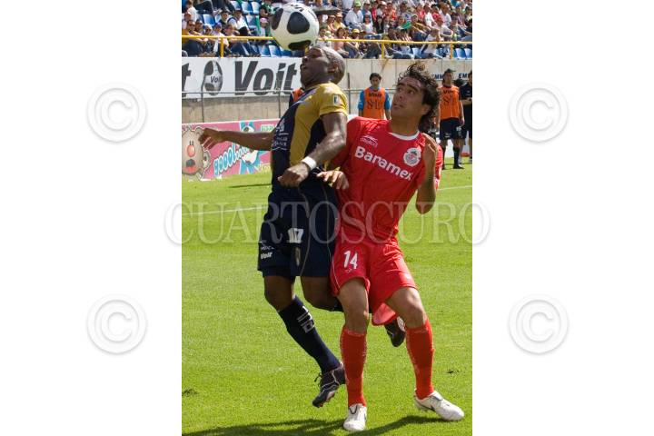 PACHUCA, HIDALGO, 02MAYO2009.- Edgar Benitez de Pachuca (izq) pelea el balón ante javier Gandolfi de Jaguares, en el partido celebrado hoy en el estadio Hidalgo ganando los tuzos 5 goles a 1, en partido de la jornada 16. FOTO: DAVID MARTINEZ PELCASTRE/CUARTOSCURO.COM